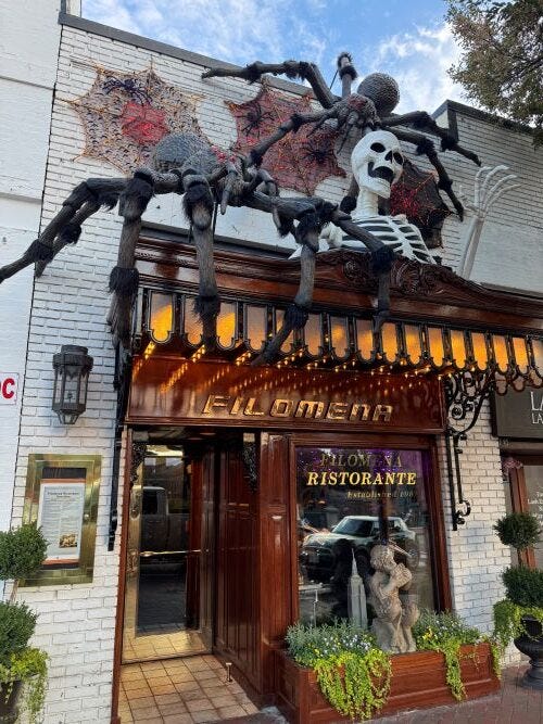 Inside, Filomena looks like old-world Italy on overdrive: latticework panels, enormous floral urns, and a riot of reds and greens straight out of a Venetian postcard — all currently sharing space ahead of Halloween with skeletons and ghouls hanging from the rafters. It’s as if Jack Skellington were let loose in an Italian piazza.