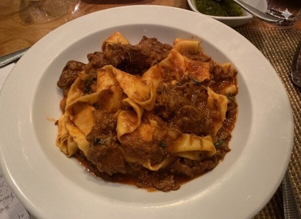 Our entrees arrive, Jeb’s having a classic with chicken parmigiana while I’m staring down a plate of short rib pappardelle that could feed a small crew. The food buys us a quiet moment to regroup before talk returns to travel, and what Jeb has learned with Greener Grass.