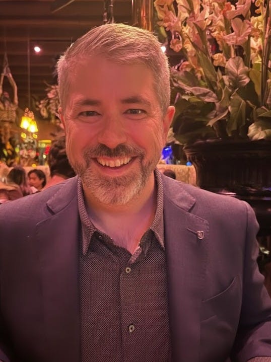 As for Jeb, his appearance is far more restrained than the restaurant’s. He’s impeccably turned out in a well-fitted navy suit, a patterned shirt, and the calm confidence of someone who might consider an airport lounge to be his second home. His expressive features are framed by neatly trimmed salt-and-pepper hair and beard. He looks so dapper that if I were a gate agent, I’d give him a free upgrade to first class.