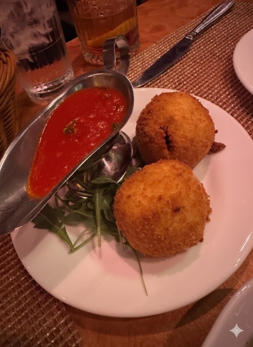 A plate of arancini lands between us, two large, round crisp golden shells giving way to soft, molten rice. They’re made with Arborio rice, stuffed with mozzarella, Bolognese meat and tiny peas, then rolled in breadcrumbs before frying. The delectable orbs come with a trough’s worth of zippy Sunday sauce, making for an excellent starter.